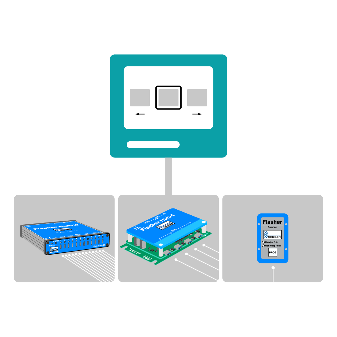 emUSB-Host host can function as a device control hub by working together with other SEGGER products, such as Flasher Hub-4, Flasher Hub-12, and Flasher Compact.