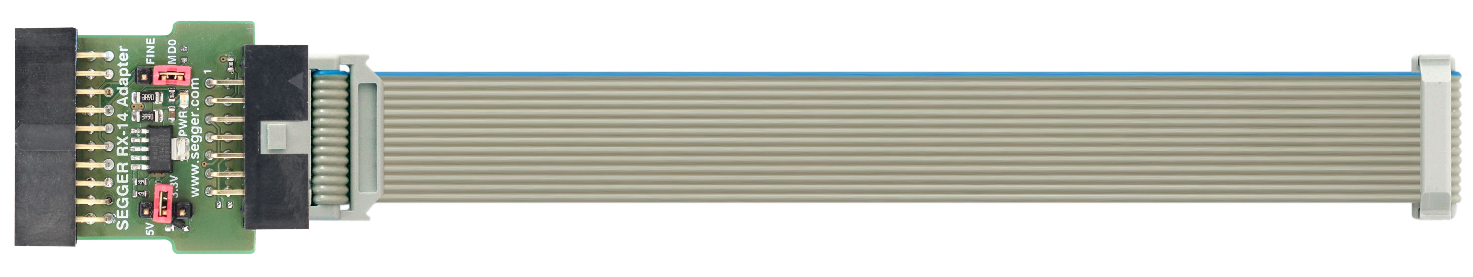 The RX Adapter allows connections between J-Link or Flasher and target hardware which comes with the Renesas RX600 / 200 / 100 series MCUs. The RX adapter is able to optionally power the connected target hardware. 3.3 V or 5 V supply voltage can be selected using a Jumper. The target is supplied via the VTref connection when the supply option is jumpered.