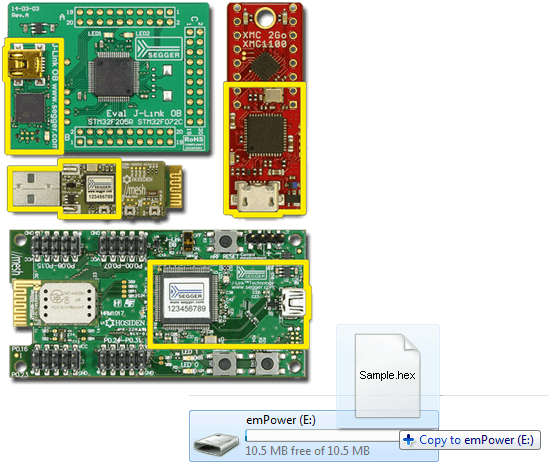 Optionally, features are available to enhance the capabilities of the J-Link OB, such as Virtual COM port (VCOM) and the Drag and Drop intuitive programming feature.