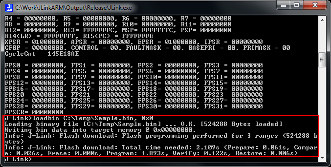 J-Link> loadbin <PathToBinFile>, <programmingaddress> - J-Link Commander executes the flash download and prints out the time statistics upon success.