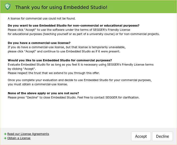 If no license for commercial use is found, Embedded Studio will run and the following window will be shown once when compiling a project or when starting a debug session.