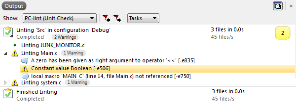 For further analysis of your code, for example to run a MISRA check on your sources, Embedded Studio features the inclusion of external tools. You can add commands to be executed and run them on your project items. The tool output is shown in the log window, and for tools such as Lint you can jump directly to reported source lines.