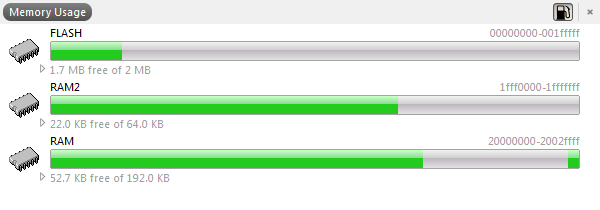 The Memory Usage Window goes more into detail to show you where the sections, i.e. code and data, are placed. The memories and its sizes are taken from your device and settings. It displays all memories you configured, such as internal Flash, RAM and also external memories.