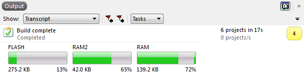 After your application has been successfully built, the log window displays the memory usage for your target device. You can immediately see how much Flash and RAM is used by your application.