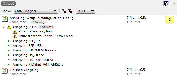 A compiler will usually generate warnings for anything that might break your application, such as uninitialized variables. To find further issues which have no immediate effect but might affect performance and to increase your code quality you can run static code analysis on your sources. All findings will be shown in the log to easily navigate to them.
