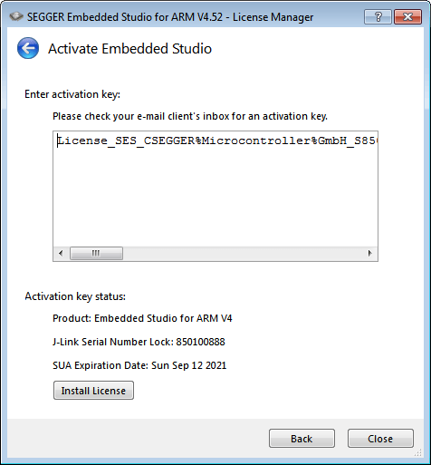 The activation is stored on a J-Link, which serves as a USB dongle for portable use of the license.