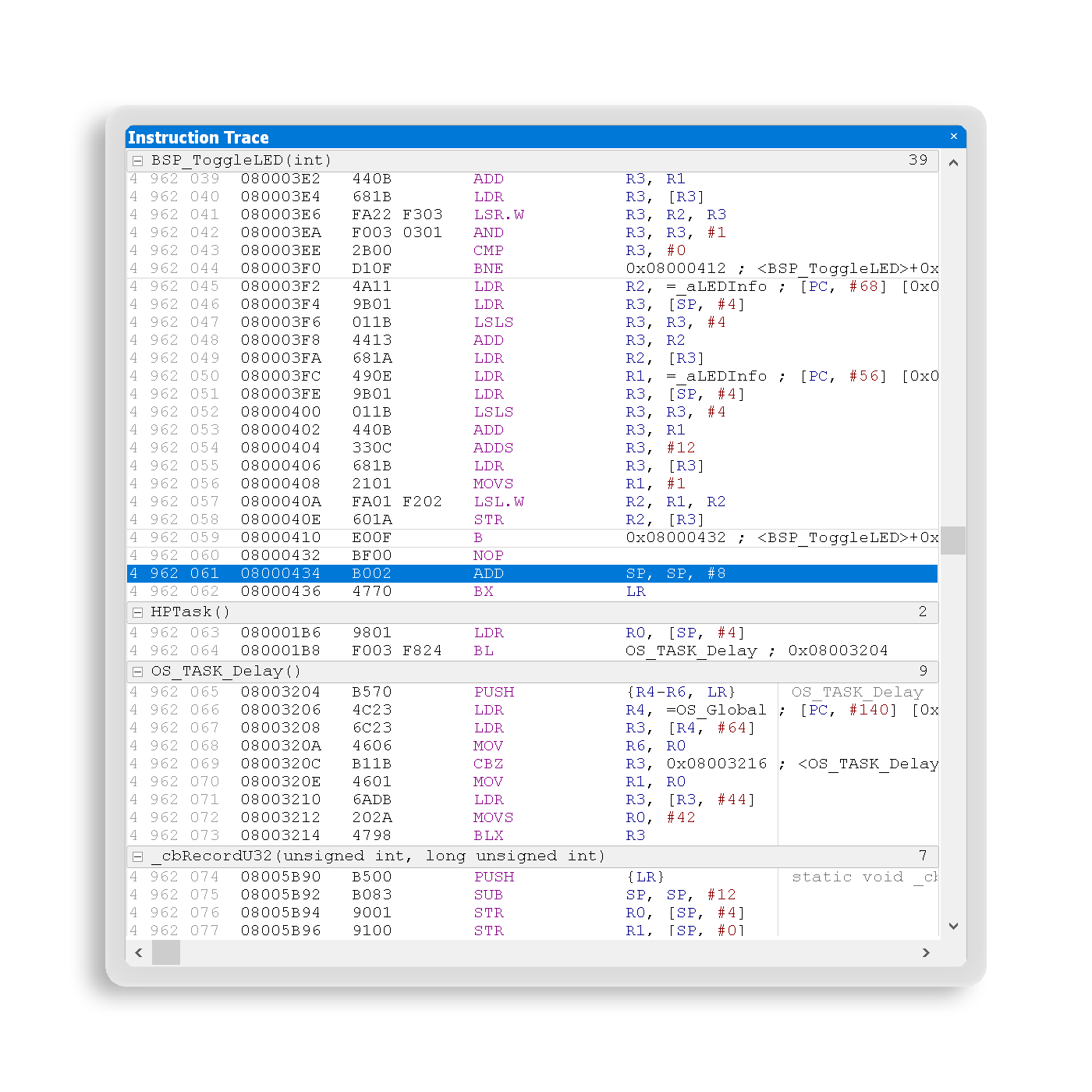 The Instruction Trace window displays complete instruction trace information acquired from a connected trace probe when a target is halted. This enables stepping back in time and precisely tracing back the instructions executed before a system reached the current stopping point. When an exception such as a mem fault or a bus fault is causing a system to halt, the trace can be used to identify the instruction triggering the fault.
