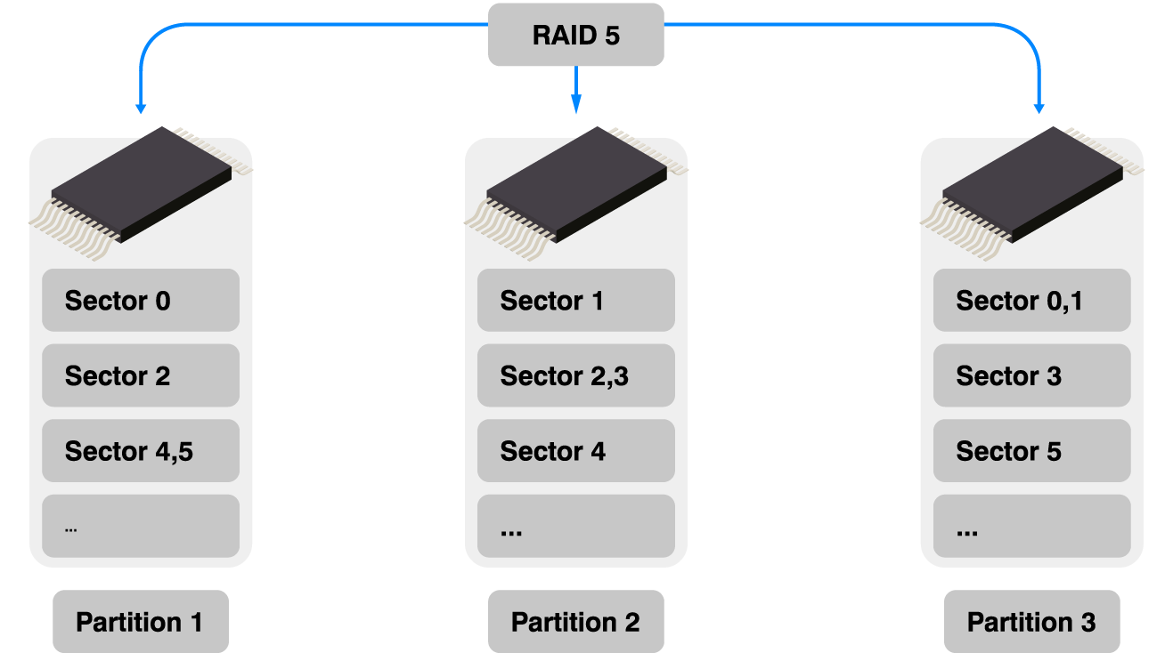 With RAID 5, emFile offers maximum data integrity and reliability with increased usable capacity. RAID 5 requires at least three storage partitions to distribute data over several partitions. Additionally, it uses less data storage to achieve the same data security as RAID 1.