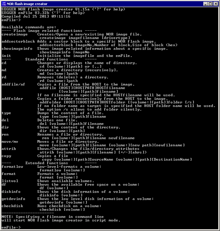 The interface of the NOR flash image is used like any other command line based program. For the ease of usage many commands are kept similar to their DOS commands.