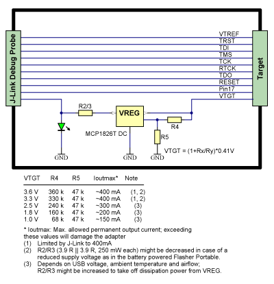 The supply voltage is fixed to 3.3 V and can be adjusted in the range 3.6 V down to 0.8 V by means of changing a single resistor on the adapter (soldering required, resistor package SMD 0805). Since the Target Supply Adapter is fed by the J-Link, its current capability is limited to 400 mA. Furthermore the current capability depends on the chosen target voltage. Example target voltage/output current combinations: