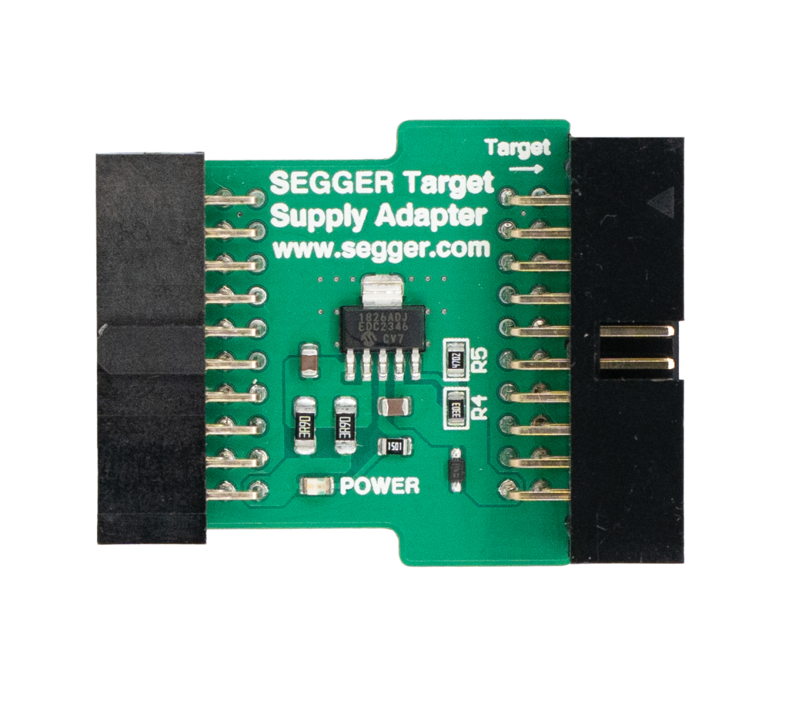 The Target Supply Adapter provides an adjustable supply voltage to the target board. It has a standard 20-pin 0.1" socket towards the J-Link debug probe or Flasher in-circuit programmer, and a standard 20-pin 0.1" header on the target side and can directly be inserted between the J-Link or Flasher and the debug cable maintaining a 1:1 connection of all debug signals. The supply voltage to the target is provided through pin 19 of the debug cable.