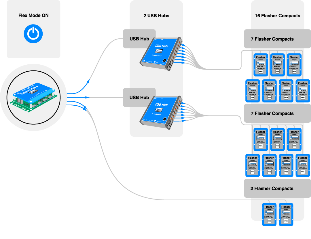 Gang programming is used to increase the throughput of a programming station. The SEGGER USB Hub-7 provides a tested USB hub to simply expand the number of available USB ports to connect up to 24 Flasher Compacts with a Flasher Hub-4 or Flasher Hub-12.