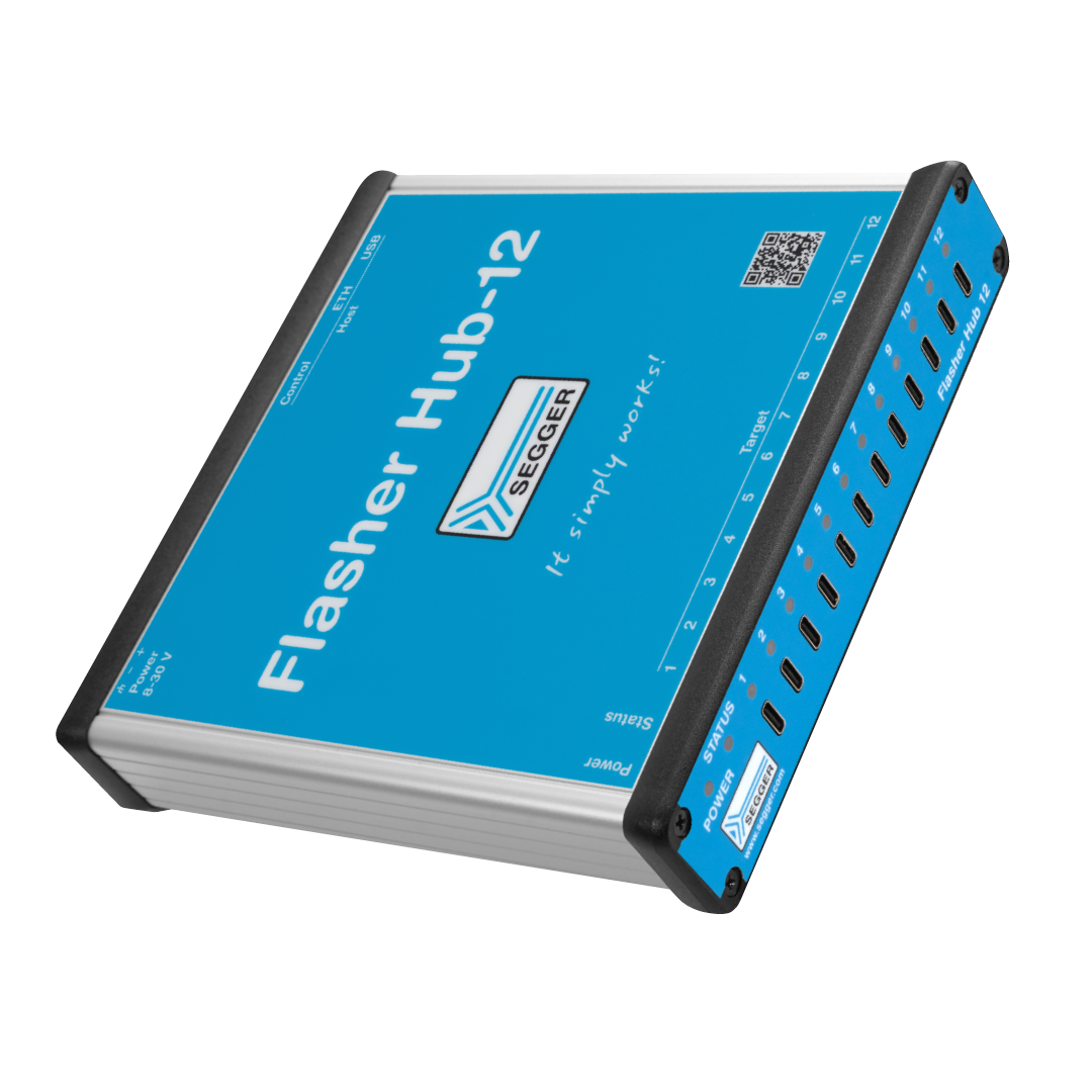 A multi-platform solution, Flasher Hub-12 comes with SEGGER's Flasher Software and Documentation Package for Windows, Linux, and macOS. It provides the tools and resources necessary for configuring, managing, and using Flasher Hub-12 effectively. It also includes flash loaders for all supported devices, including a wide range of target microcontrollers. The list of supported manufacturers, families and devices, and SoCs provides a detailed overview.