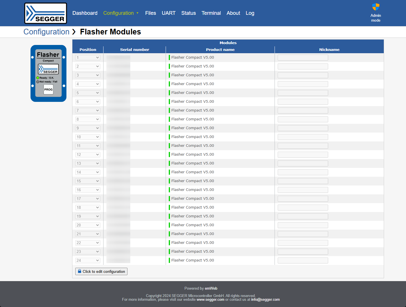 The Flasher Hub-12/Flasher Compact system is set up once per channel using SEGGER's Flasher software, tailored to the flash chip type. The Flasher Hub-12 can operate independently via TELNET, without the need for a desktop PC.