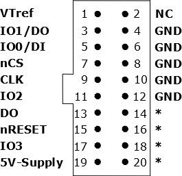 | 13 | DO | Input | Single: Data-out of target SPI. Input of programmer, used to receive data from the target SPI. Quad: Must be connected to same signal as pin 3 IO1/DO to guarantee correct operation for temporary single mode transfers during QSPI mode. |