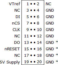 | 19 | 5V-Supply | Output | This pin can be used to supply power to the target hardware. Older Flashers may not be able to supply power on this pin. |