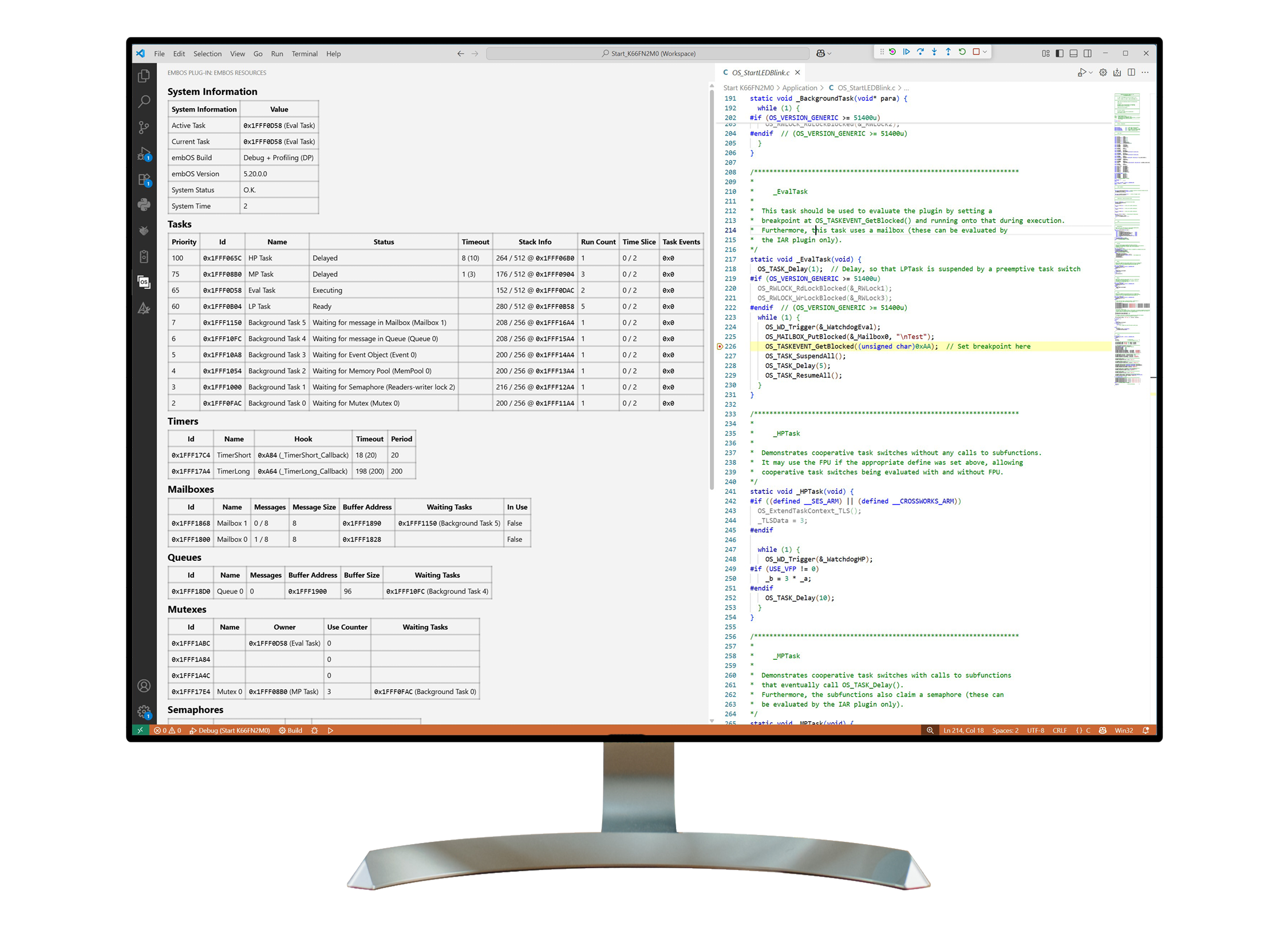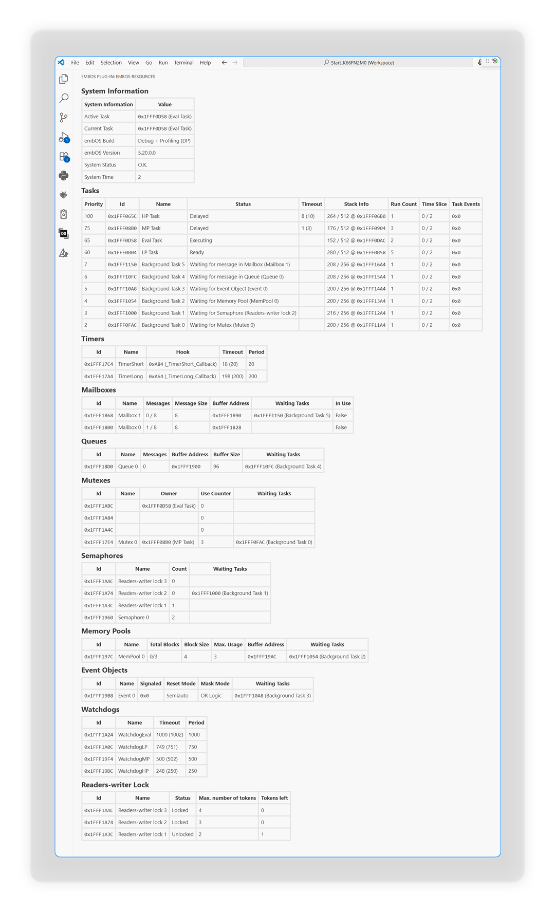 SEGGER's embOS plug-in for Visual Studio Code provides embOS awareness during debugging sessions. This enables you to inspect the state of several embOS primitives such as the tasks and created embOS objects. Moreover, the embOS plug-in allows you to monitor not only the active tasks, but also inactive tasks, too.