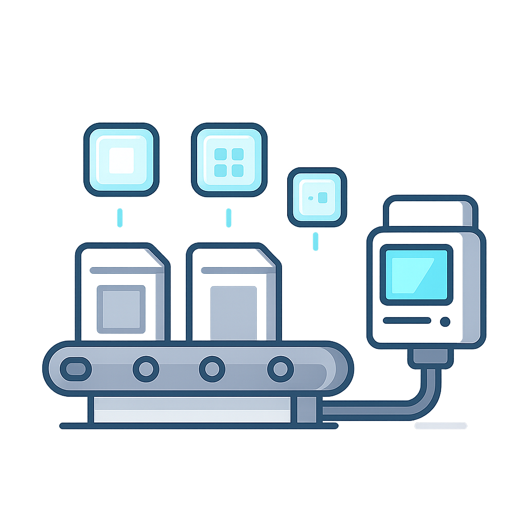 An illustrated conveyor belt features two containers with digital screens above displaying various icons. On the right, a machine with a monitor connects to the conveyor, suggesting a technological process or automation system. The image conveys themes of industry and innovation.