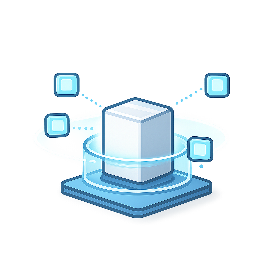 An abstract graphic depicting a central white cube surrounded by a glowing circular outline. Four smaller blue squares are positioned around it, connected by dotted lines. The background is a gradient of dark gray, enhancing the focus on the central cube and its surrounding elements.