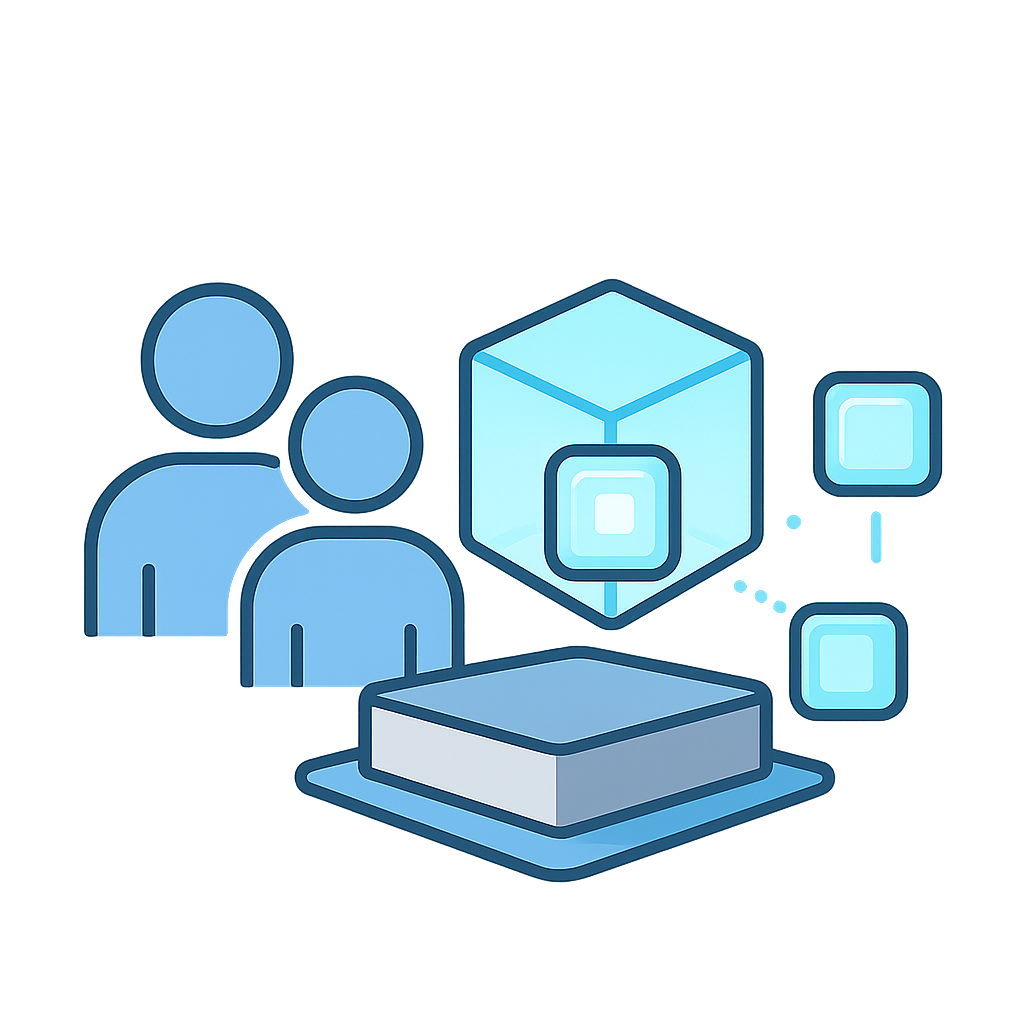 An illustration depicting two simplified figures representing people, alongside a geometric shape symbolizing data or information. Small squares surrounding the central shape suggest digital interaction or processing, conveying themes of collaboration and technology.